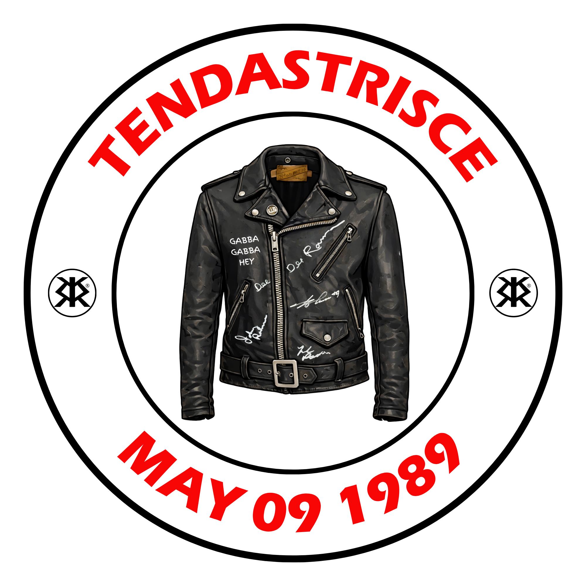 T-SHIRT TRIBUTO AL 9 MAGGIO 1989, NOTTE DEI RAMONES AL TEATRO TENDASTRISCE DI ROMA. IN SCENA LA LEGGENDARIA GIACCA DI PELLE NERA CON LE FIRME DI JOEY, JOHNNY, DEE DEE E MARKY. ROMA COME NEW YORK.